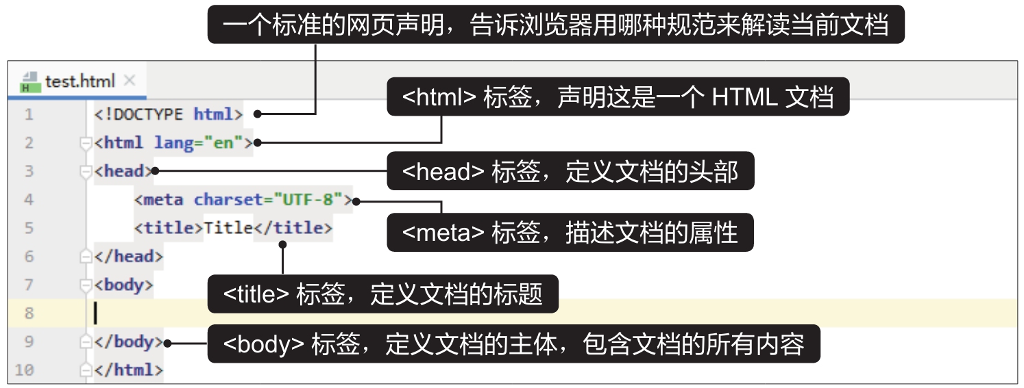 先使用PyCharm编辑器创建一个HTML文档。启动PyCharm,执行“File>New”菜单命令,在弹出的界面中单击“HTML File”,再在弹出的界面中输入文件名“test”,按【Enter】键,PyCharm会自动补全文件的扩展名,得到一个名为“test.html”的HTML文档。该HTML文档的内容并不是空白的,PyCharm会自动生成一些网页源代码,搭建出一个HTML文档的基本框架,如下图所示。